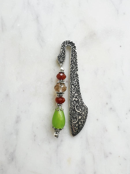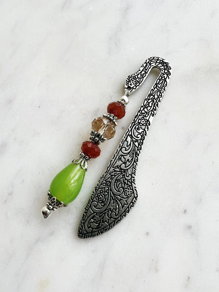 Elevate your reading ritual with this beautifully handcrafted bookmark, created using a mix of repurposed vintage beads and unused new old stock treasures. The bead combination blends warm, earthy ambers and deep reds with a striking glass lime-green teardrop bead, giving the piece a vibrant, boho-autumn feel.
