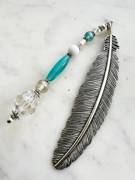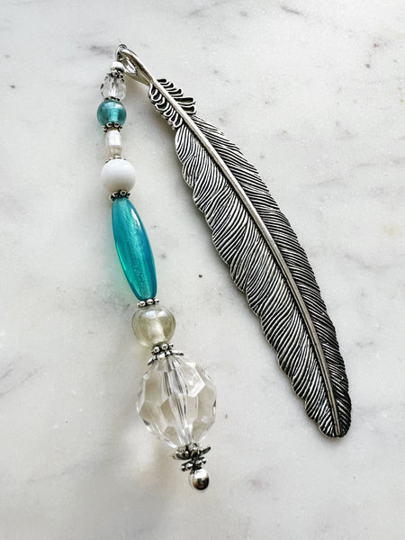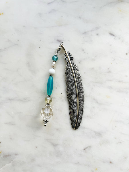 The silver-tone feather adds a classic vintage feel, while the strand of aqua, pearl, and clear crystal beads catches the light beautifully, creating a soothing, boho-luxe aesthetic. Perfect for those who love unique, one-of-a-kind accessories that tell a story.
