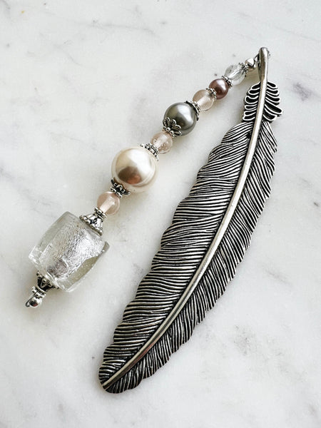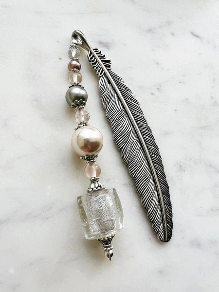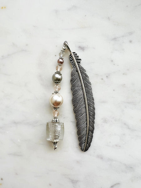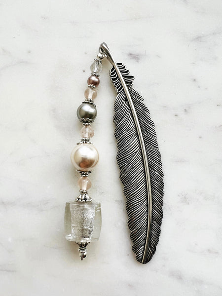 Elevate your reading ritual with this elegant handmade feather bookmark, crafted using repurposed beads from broken vintage jewellery. Soft neutral tones, shimmering crystals, and luminous glass pearls come together to create a sophisticated, timeless piece with a gentle boho feel.