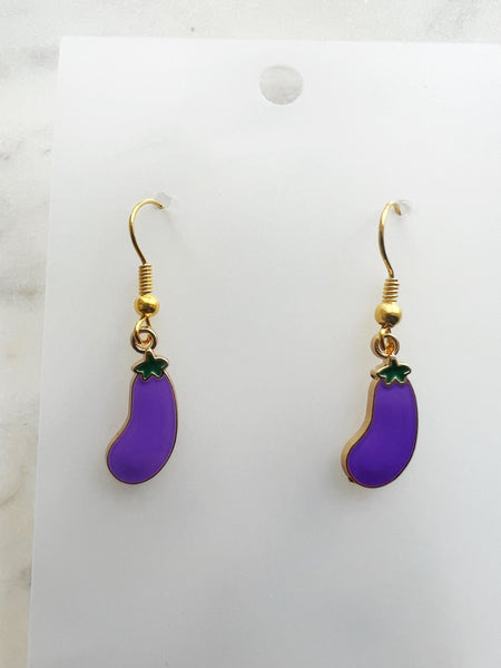 🍆 Kawaii Enamel Eggplant Dangle Earrings – Purple Veggie Earrings