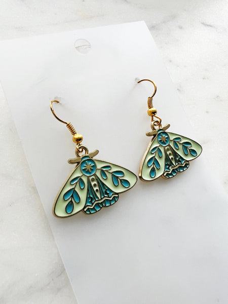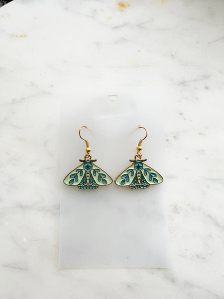 Kawaii Enamel Mint Botanical Moth Dangle Earrings