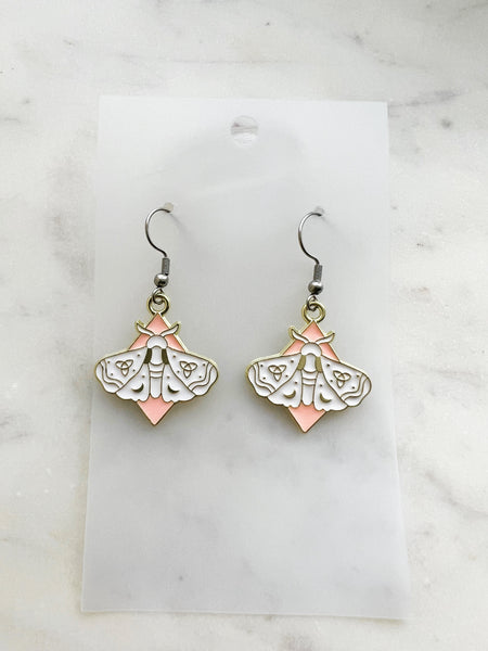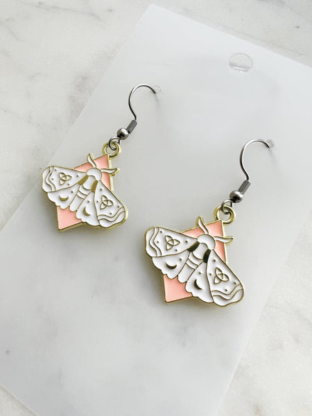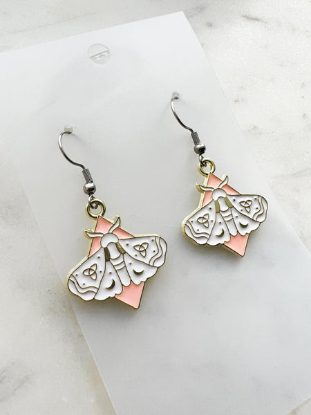 Design: White and blush-pink enamel moth with crescent moon + trinity knot detailing