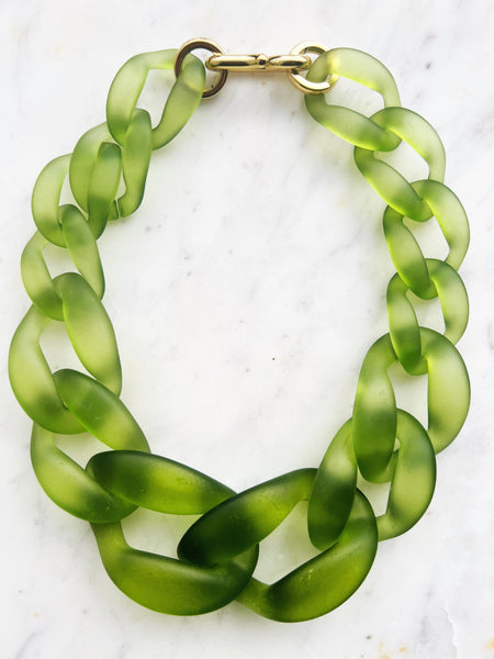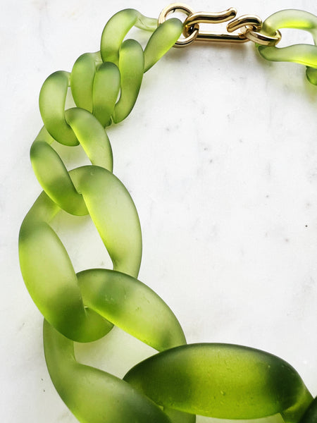 Make a bold yet beautifully wearable statement with this striking frosted acrylic chain necklace. Featuring oversized twisted links in a fresh, translucent green, this piece brings a modern edge with a soft, matte finish that catches the light without overpowering your look.